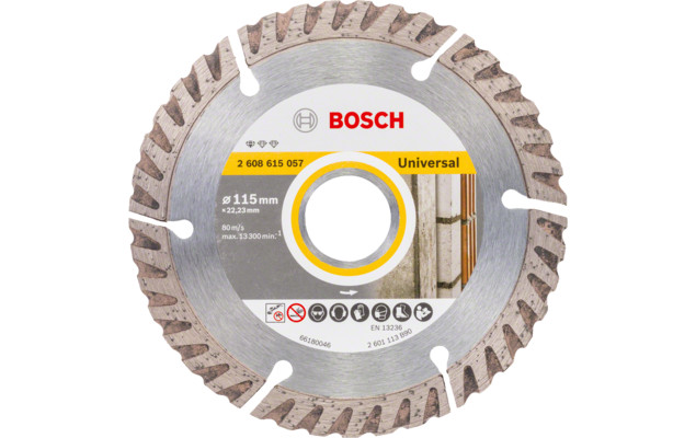 Diamentowa tarcza tnąca Standard for Universal umożliwia skuteczne cięcie w popularnych materiałach budowlanych. Zoptymalizowana osnowa diamentowa zapewnia solidne rezultaty dzięki wysokiej jakości wykonania tarczy. O utrzymanie tych standardów dba znajdujące się w Szwajcarii centrum kompetencyjne Bosch w zakresie technik diamentowych. Produkt przeznaczony do cięcia materiałów budowlanych, takich jak beton czy podłoże z muru.