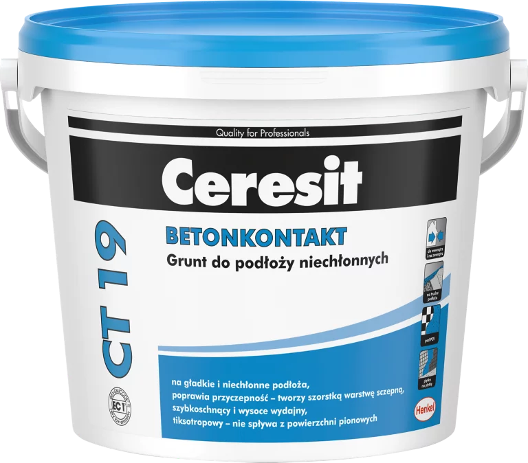 Ceresit CT 19, 5 kg, preparat do gruntowania na powierzchniach poziomych i pionowych, na podłożach nasiąkliwych i nienasiąkliwych, tworzący warstwę sczepną, zalecany do trudnych i gładkich powierzchni